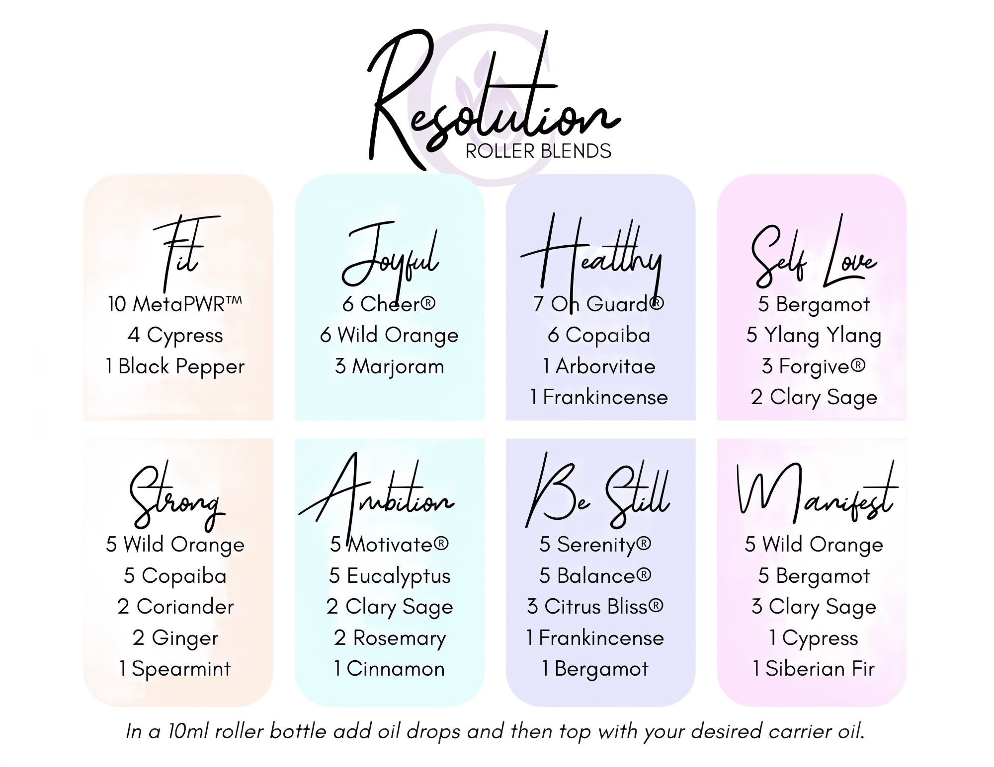 Whatever your resolutions may be, there are oils that can help! Here are some fun blend ideas to incorporate into your New Year. These recipes can be made up as roller bottles OR made into diffuser blends.