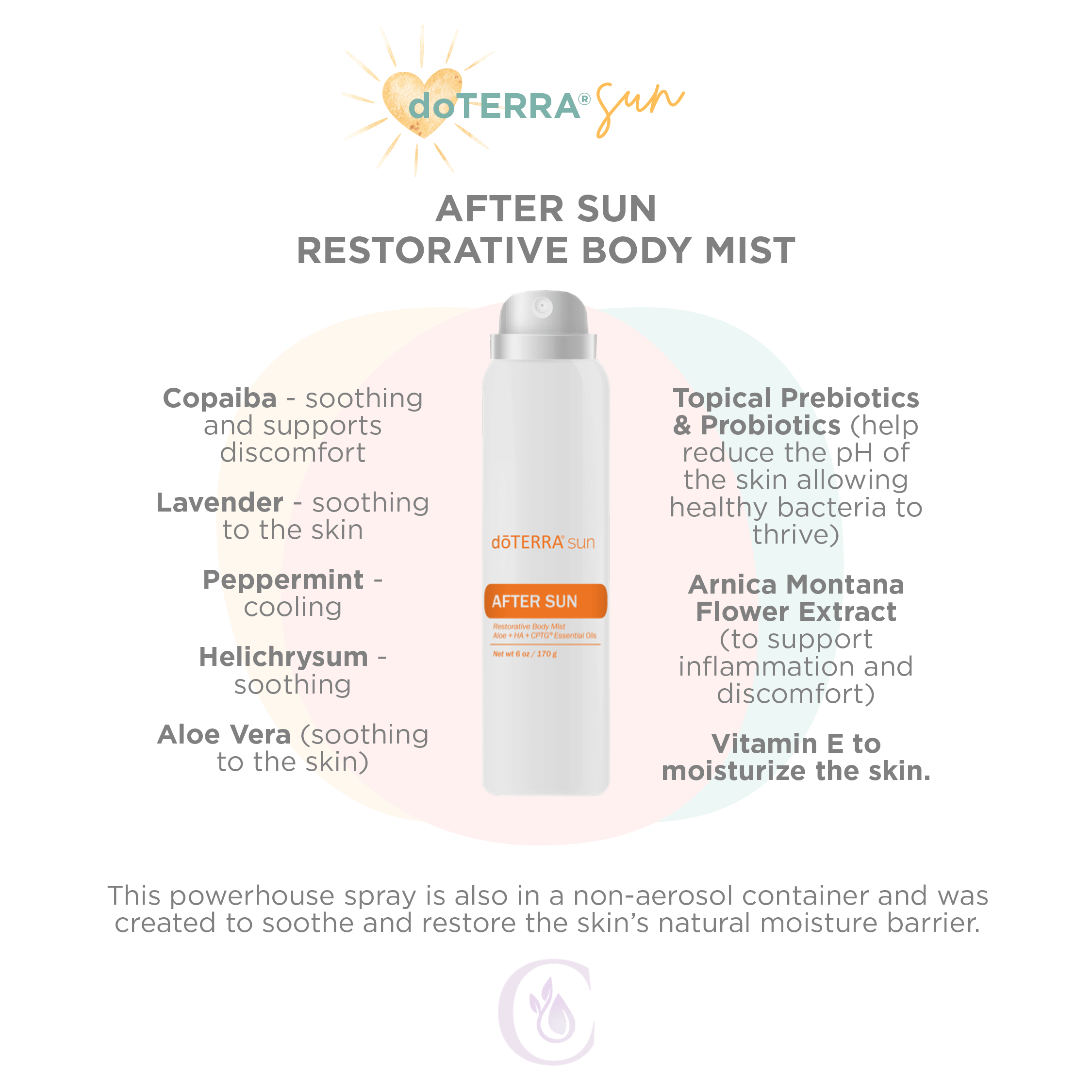 When your day in the sun is winding down, make sure to treat your skin with an after-sun potion that will soothe and help it to counteract any ill effects from the UV rays it has been exposed to. dōTERRA has a beautiful ready-made after-sun mist, but you can also make one for yourself with your essential oils and a spray bottle.
