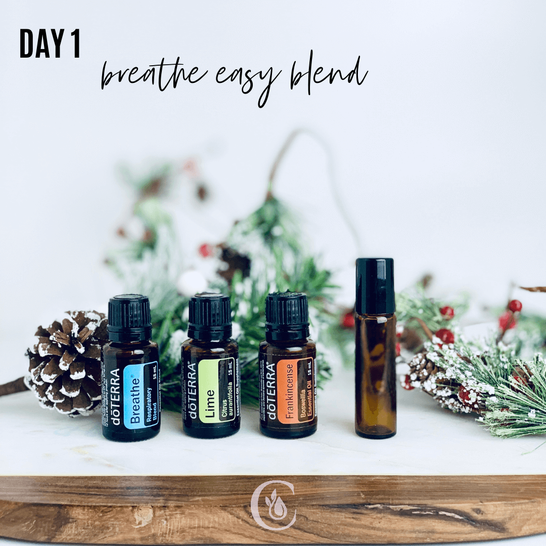 Day 1: Frankincense, Lime, Easy Air This is one of my favourite blends for respiratory issues! This blend can be used to clear airways, soothe mild coughs, and help reduce phlegm. Topically: Combine 3-5 drops of Frankincense, Lime and Easy Air to a 10mL roller, and top up with carrier oil. (Check dilution ratios below for age-appropriate dilution.) Apply to chest as needed. Aromatically: Add 3-5 drops of each in your diffuser.