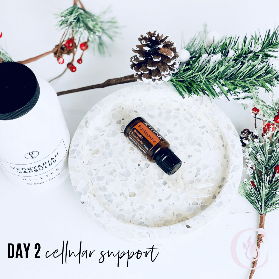 Day 2: Cellular Support One of Frankincense’s most powerful benefits is its ability to promote healthy cellular function. Try taking Frankincense oil internally by dropping 1-2 drops under the tongue, or adding one to two drops in a Veggie capsule to swallow, This natural supplement will help support healthy cellular function while boosting your immune system. (dōTERRA also offers Frankincense in a capsule, if you don't want to make your own.)