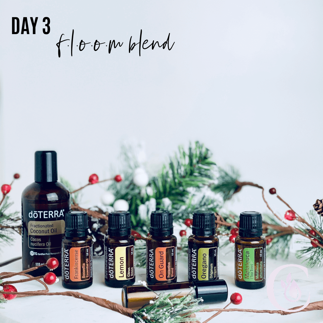 Day 3: F.L.O.O.T Blend (Frankincense, Lemon, Oregano, On Guard, Tea Tree) This blend is a go-to anytime our bodies need some big guns to fight off more of the intense environmental threats. What makes this "Floo bomb" so powerful is the immunity boosting blend of essential oils. These oils not only actively kill pathogens, they also activate your white blood cells so they fight off threats more aggressively. You can take the Floo Bomb internally via a shot glass or a veggie capsule, or make a roller bottle for topical use. (See roller bottle dilution ratios below.)