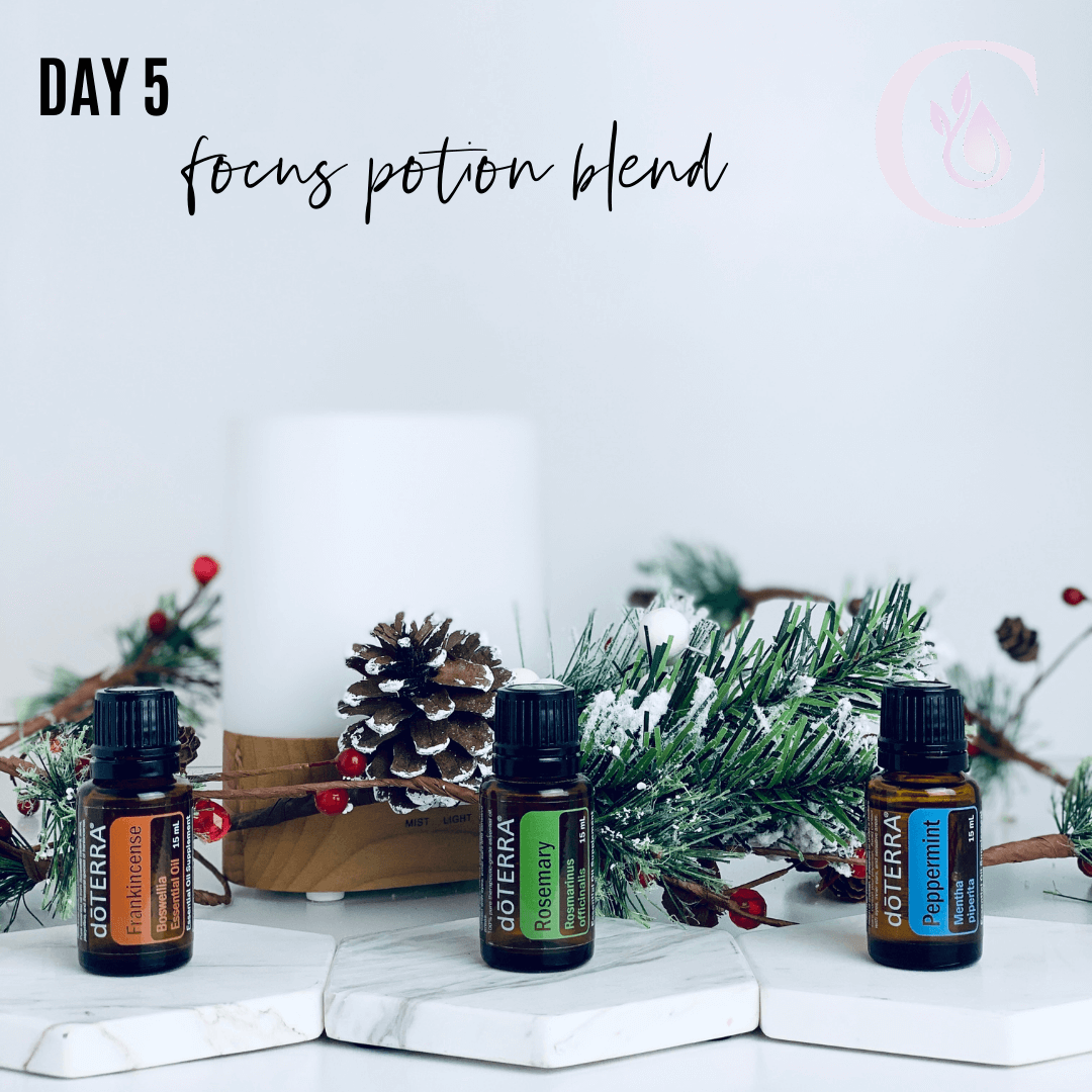 Day 5: Focus Potion Do you have a difficult time staying focused, have a big project coming up for work, maybe children in school who need some extra support to focus on the task at hand? Whatever the case may be, this blend can help your mind and body stay on task and focused. Topically: Combine desired drops to a 10ml roller, apply to back of neck and wrist as needed. Aromatically: Diffuse 2-3 drops of each oil to increase productivity.