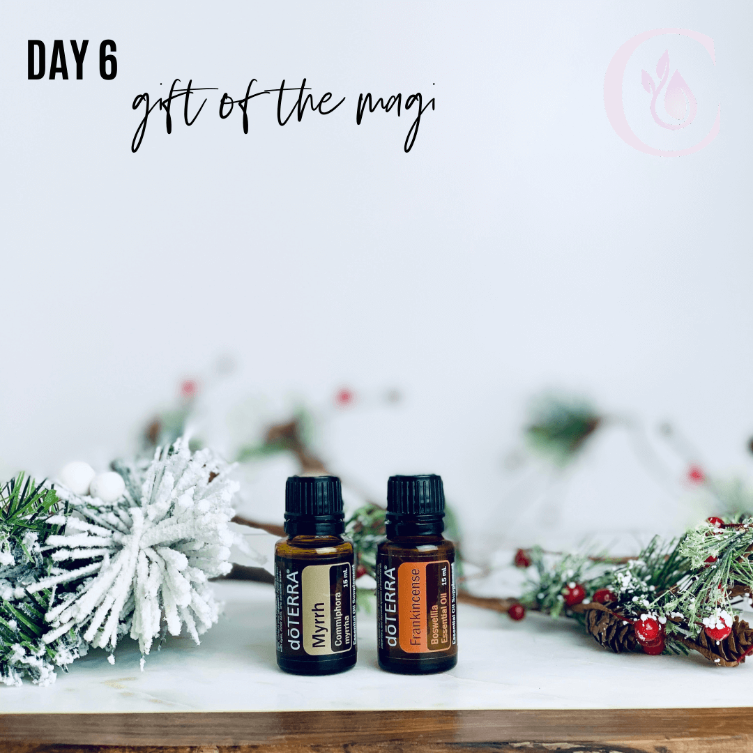 Day 6: Gifts of the Magi -- Frankincense & Myrrh The three gifts of the magi had a symbolic meaning: gold symbolized virtue, frankincense symbolized prayer, and myrrh symbolized suffering. What better time to celebrate the Gift of Magi than during the Christmas Season! This blend is magical for the skin as well as the emotions. Topically: Combine desired drops to a 10ml roller, apply to back of neck, spine, and feet. Aromatically: Diffuse 2-3 drops of each to clear stagnant energy.