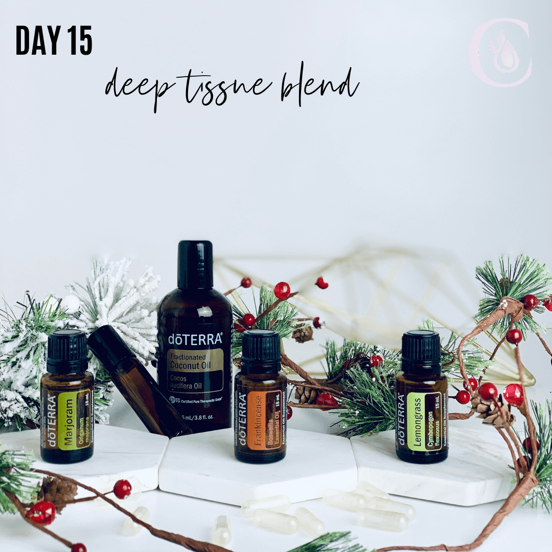 Day 15: Deep Tissue Blend -- Frankincense, Marjoram, Lemongrass This is a favourite blend when you have mild to moderate joint inflammation. Combine 10 drops of each oil in a 10ml roller and fill the rest with FCO.