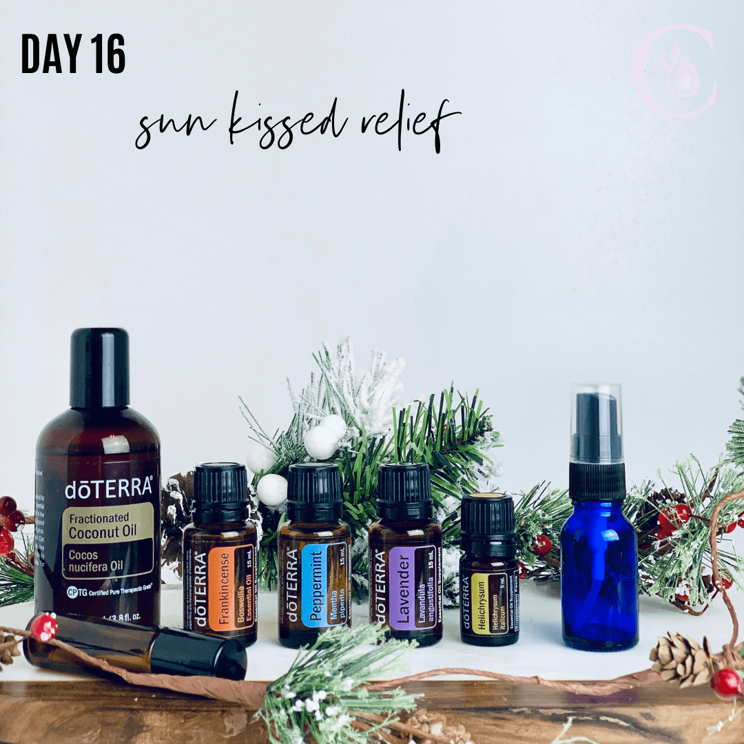 Day 16: Sun Kissed Relief -- Frankincense, Peppermint, Lavender, Helichrysum Too much fun in the sun can lead to skin damage. This is an excellent blend to soothe mild skin irritations due to over-done sun exposure. The cooling sensation will leave your skin feeling cool and rejuvenated. Combine 5-10 drops of each in a spray bottle, fill half with FCO and the rest with water. Spray as needed.