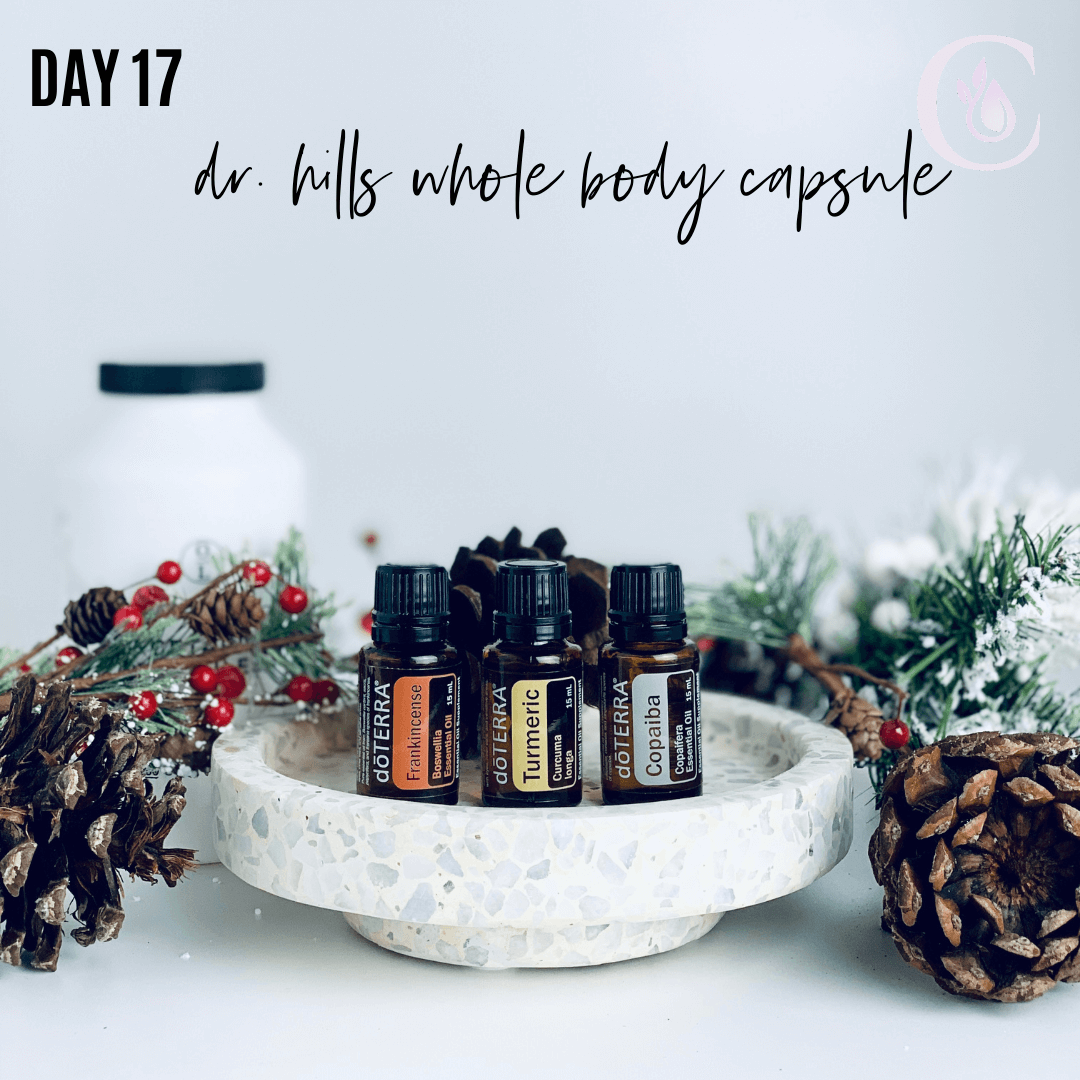 Day 17: Dr. Hill's Whole Body Capsule -- Frankincense, Turmeric, Copaiba Dr. Hill’s whole-body capsule is a powerhouse combo to boost cellular function, increase immune response, and support a healthy inflammatory response in your body. Mixing these together and taking internally daily will give you a powerhouse of support. Take 2-3 drops in a veggie capsule daily.