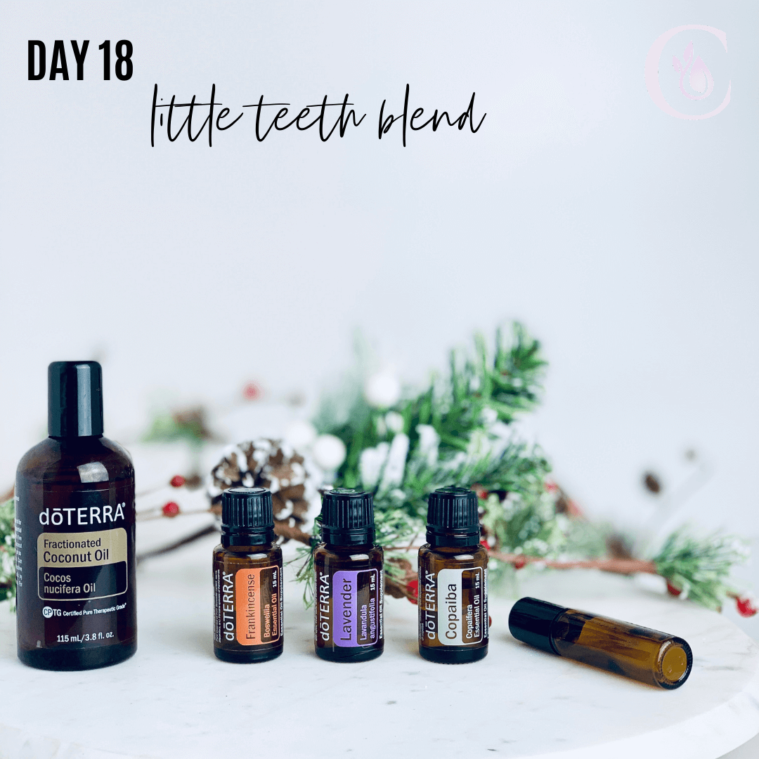 Day 18: Little Teeth Blend -- Frankincense, Lavender, Copaiba This tried and true blend has been used over and over to support little ones through the teething process. This combo helps to reduces inflammation while providing soothing relief. In a 10ml roller combine 3-5 drops of each oil, fill the rest with FCO. Apply along the jawline as needed.