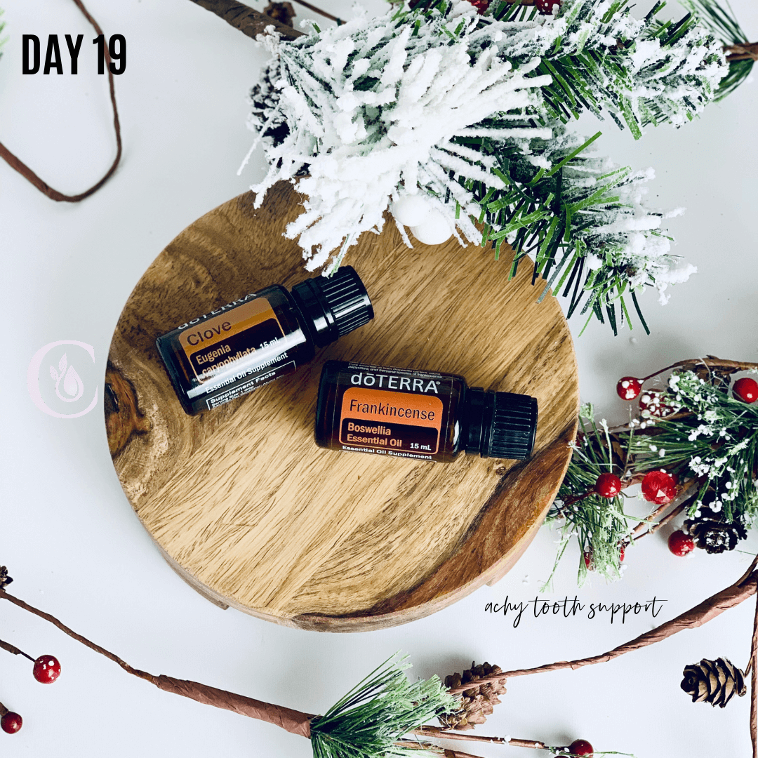 Day 19: Achy Tooth Support -- Frankincense & Clove If you have ever experienced a tooth ache then you will know the excruciating pain it causes. Frankincense and Clove together are excellent to reduce temporary pain and inflammation You can apply these oils neat on the area of need, but Clove is a hot essential oil so dilution with a carrier oil is recommended.