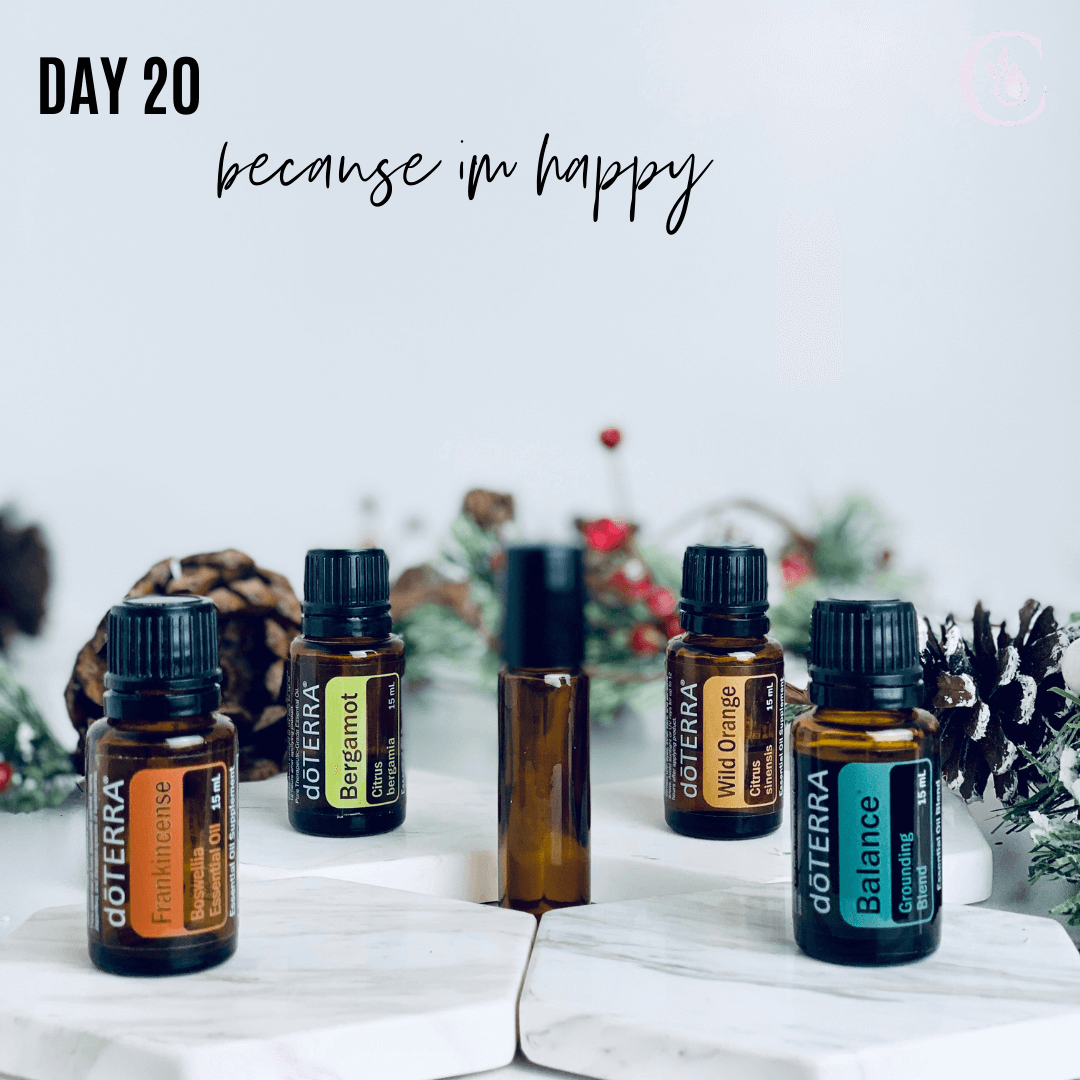 Day 20: Because I'm Happy-- Frankincense, Bergamot, Wild Orange & Balance I love the powerful effects essential oils have on our moods. This uplifting blend will leave you singing “Because I’m Happy,” all day long. Combine 5 drops of each in a 10ml roller fill the rest with FCO. Apply as needed