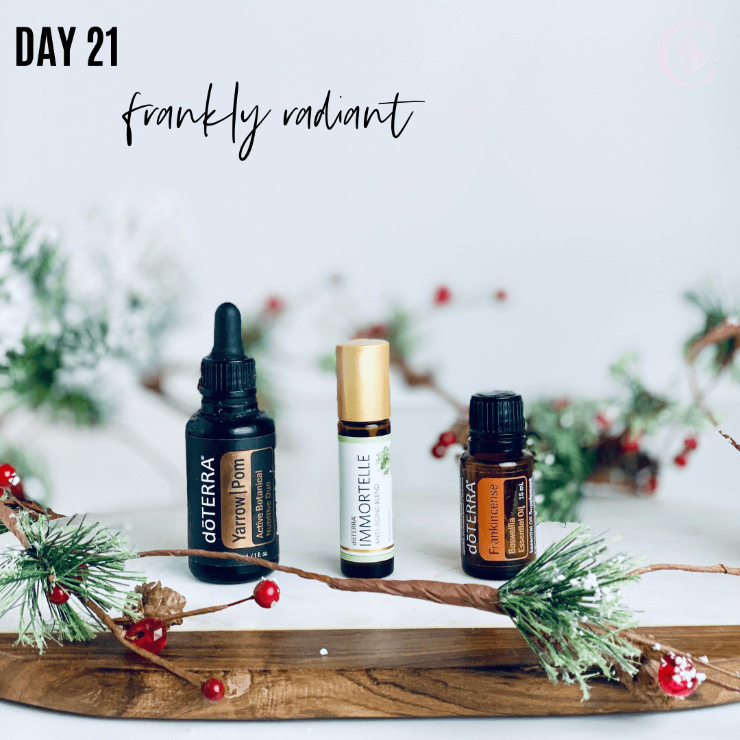 Day 21: Frankly Radiant -- Frankincense, Yarrow|Pom, Immortelle These oils not only can aid as an anti-aging regime, they’re powerful antioxidants to nourish your skin. Layer them on your skin after cleansing and toning, then top with your moisturizer of choice.