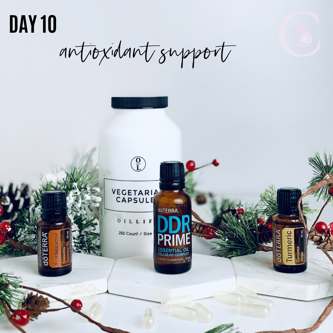 Day 10: Antioxidant Support -- Frankincense, DDR Prime, Turmeric Antioxidants are substances that can prevent or slow damage to cells caused by free radicals, unstable molecules that the body produces as a reaction to environmental and other pressures. This combination of essential oils can help to reduce the damage of oxidative stressors and help rejuvenate the cells. Take 2-3 drops of each in a veggie capsule daily or as needed.