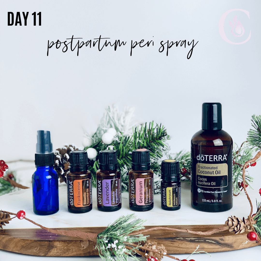 Day 11: Post Partum Peri Spray -- Frankincense, Lavender, Geranium, Helichrysum Childbirth is a beautiful thing; however, the birthing process can be traumatic for the perineal area. Having safe, holistic tools to heal the body after bringing a new life into this world is a real blessing! In a spray bottle, combine 10 drops of each essential oil. Fill the bottle half way with FCO, and the rest with water. Spray on the perineum area during the birthing process and after to ease discomfort and promote healing.