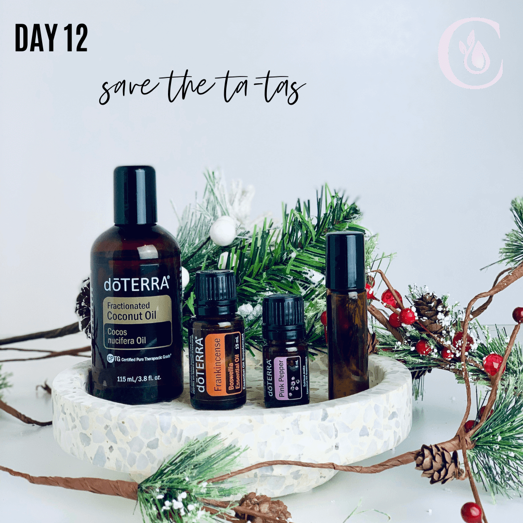 Day 12: Save the Ta-Ta's -- Frankincense, Pink Pepper It’s important for all women to have routine check-ups for breast health. This is an excellent blend to support and promote healthy breast tissue. Combine 5 drops of each essential oil in a 10ml bottle, and fill the rest with FCO. Massage into the breasts daily.