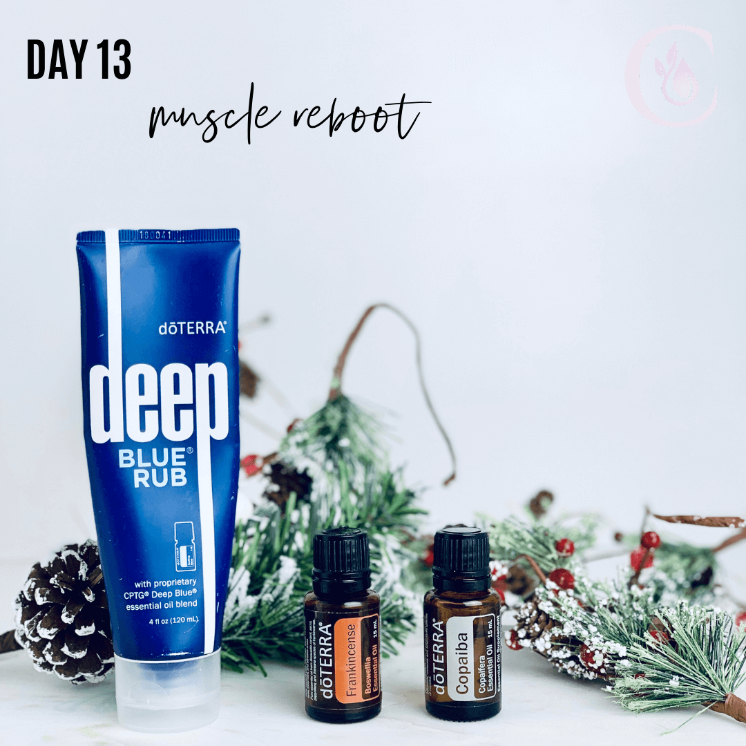Day 13: Muscle Reboot -- Frankincense, Deep Blue Rub, Copaiba After a strenuous workout, combine these three products to soothe joints and muscles.