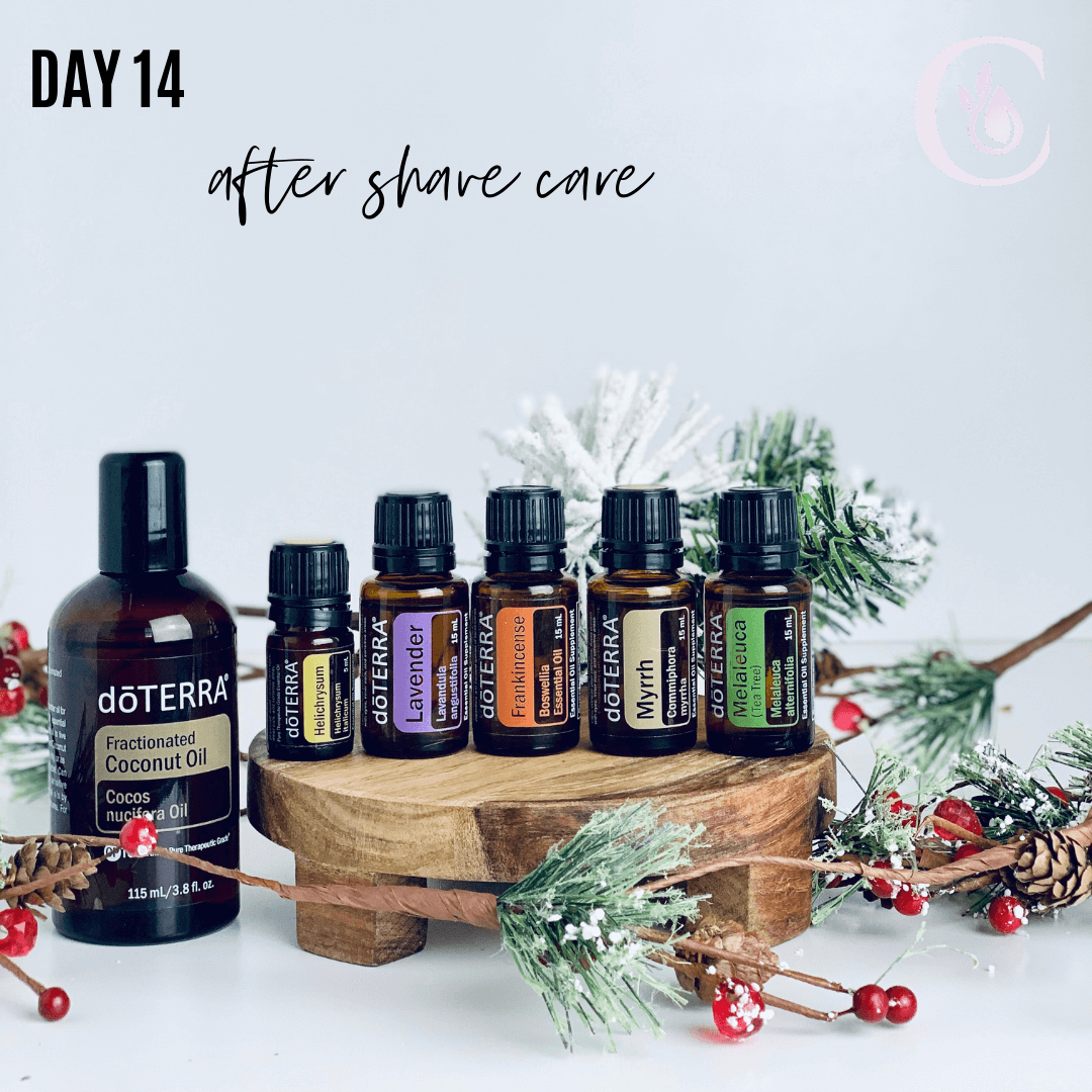 Day 14: After Shave Care -- Frankincense, Lavender, Myrrh, Helichrysum, Tea Tree Razor burn and bumps can turn your morning shave into a daylong frustration. Even though shaving may be essential, razor damage is not. Provide relief to your skin with this serum. It will soothe the skin and leave your skin feeling fantastic all day long. In a 10ml roller combine 2-3 drops of each essential oil, and fill the rest with FCO. Apply as needed after a shave.