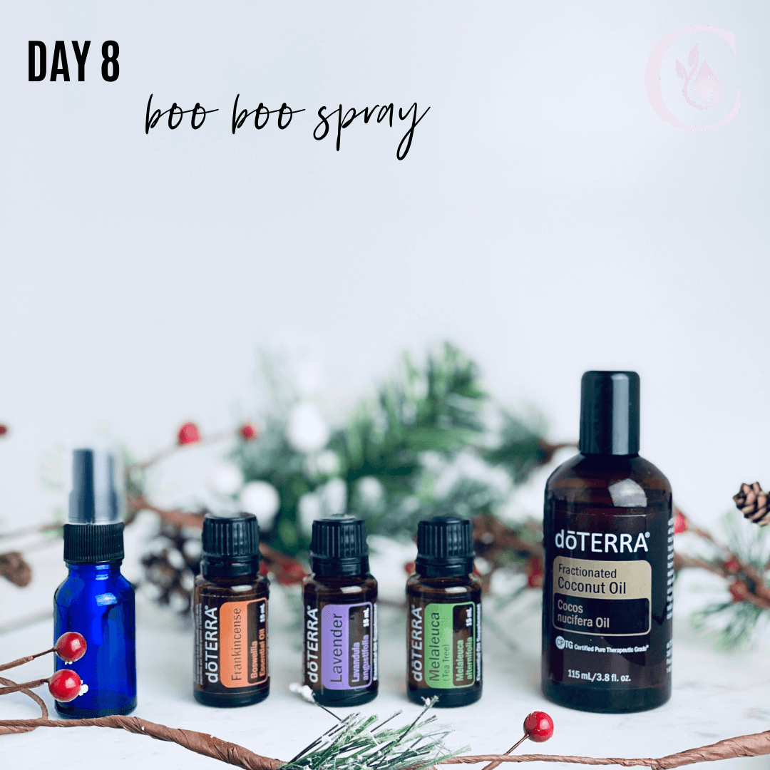 Day 8: Boo-Boo Spray -- Frankincense, Lavender, Tea Tree If you have kids of any age, boo-boos are inevitable. This is an amazing spray to not only cleanse the area of need, but also soothe any irritation. Combine 10 drops of each essential oil in spray bottle, add a little bit of FCO and fill the rest with water. Spray as needed.