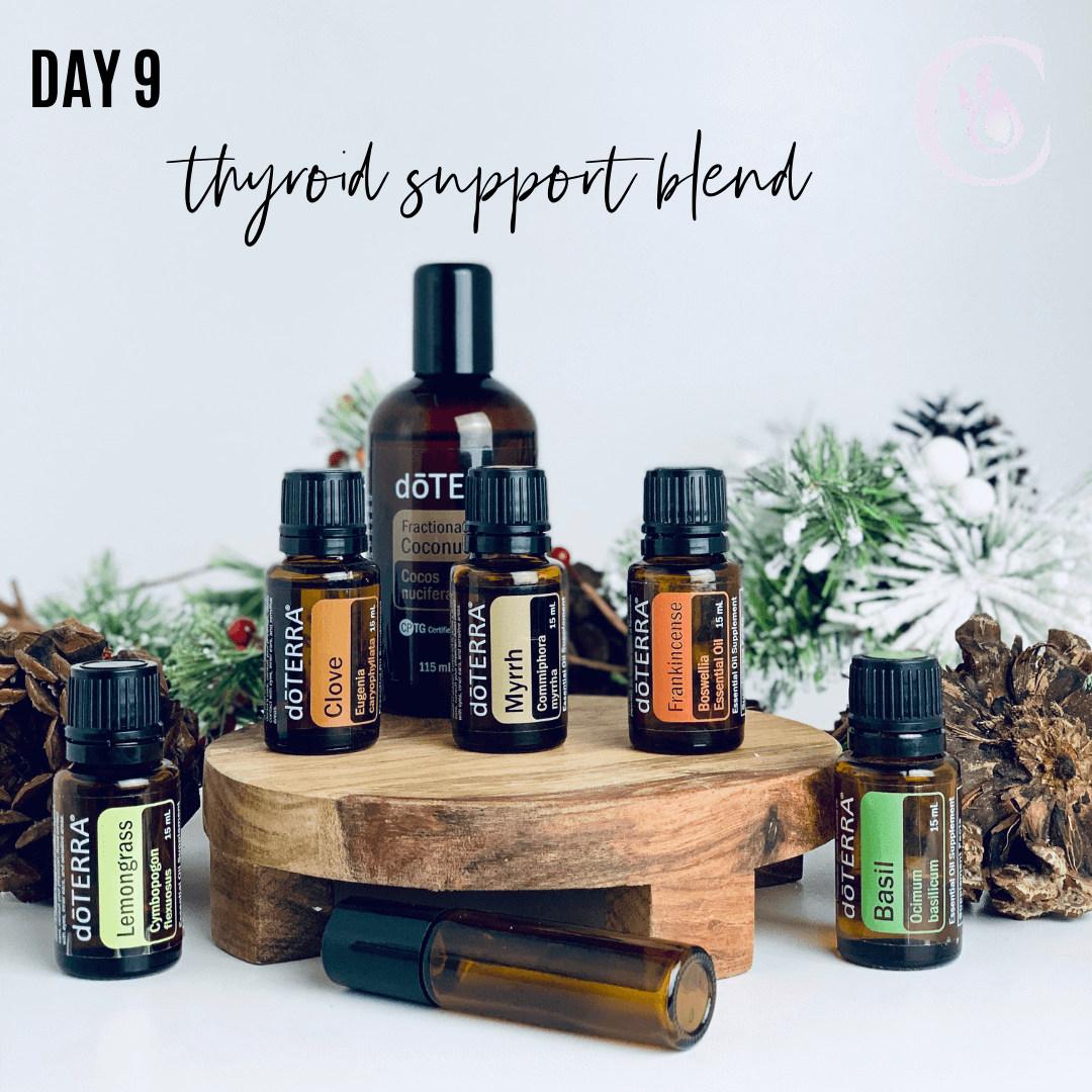 Day 9: Thyroid Support Blend -- Frankincense, Lemongrass, Clove, Myrrh, Basil So many people need extra support when it comes to the thyroid, and this is a perfect blend for it. Combine 7 drops of each essential oil in a 10 ml roller, fill the rest with FCO roll over thyroid day and night.