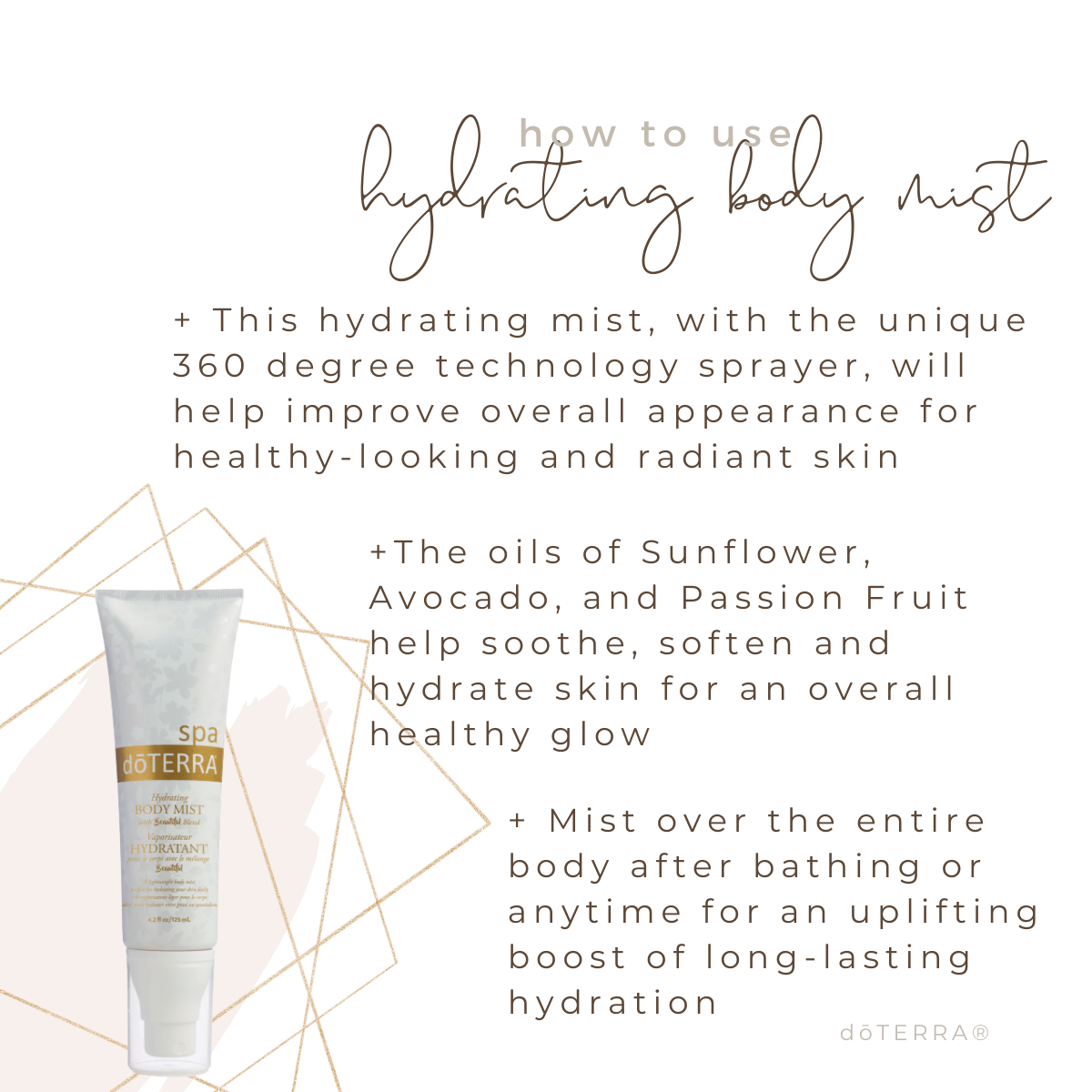 doTERRA's Beautiful Hydrating Mist is a much better, healthier choice -- and it's a VERY versatile product. I love using it as after-shower hydration, applying it while my skin is still a little damp. But, you can also use it as an after sun spray,as a hair mask (use 10-15 pumps into your hair) or frizz tamer (spray once into your hand and smooth onto your hair), as a rash guard (prevent chaffing under the breasts or on the inner thighs), as a cuticle oil, and as an after shave spray. You will love the wonderful fragrance of this gorgeous, all-natural product.