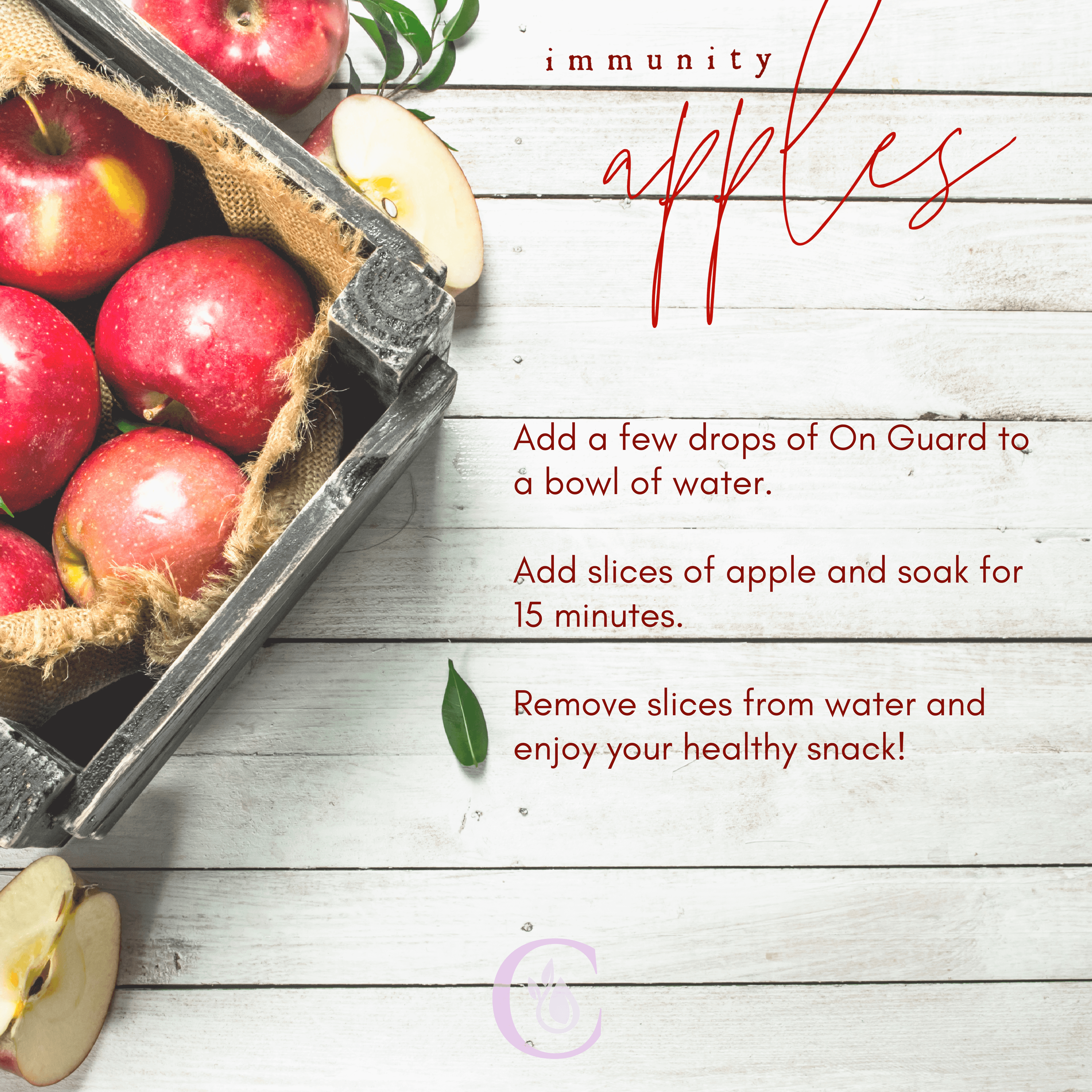 Tip #2: Eat healthy! Halloween ushers in the season of candy, and sugar is one of the worst things for the immune system. Stick with Nature's own "candy," healthy fruits and vegetables. There is a recipe below that will help you increase the immunity value of Fall's delicious apple harvest. Soaking fruit in water and a drop or two of essential oil is a fantastic way to amplify flavour and increase the health benefits. This recipe calls for apples and On Guard, but you should also try grapes with Wild Orange... delicious!!