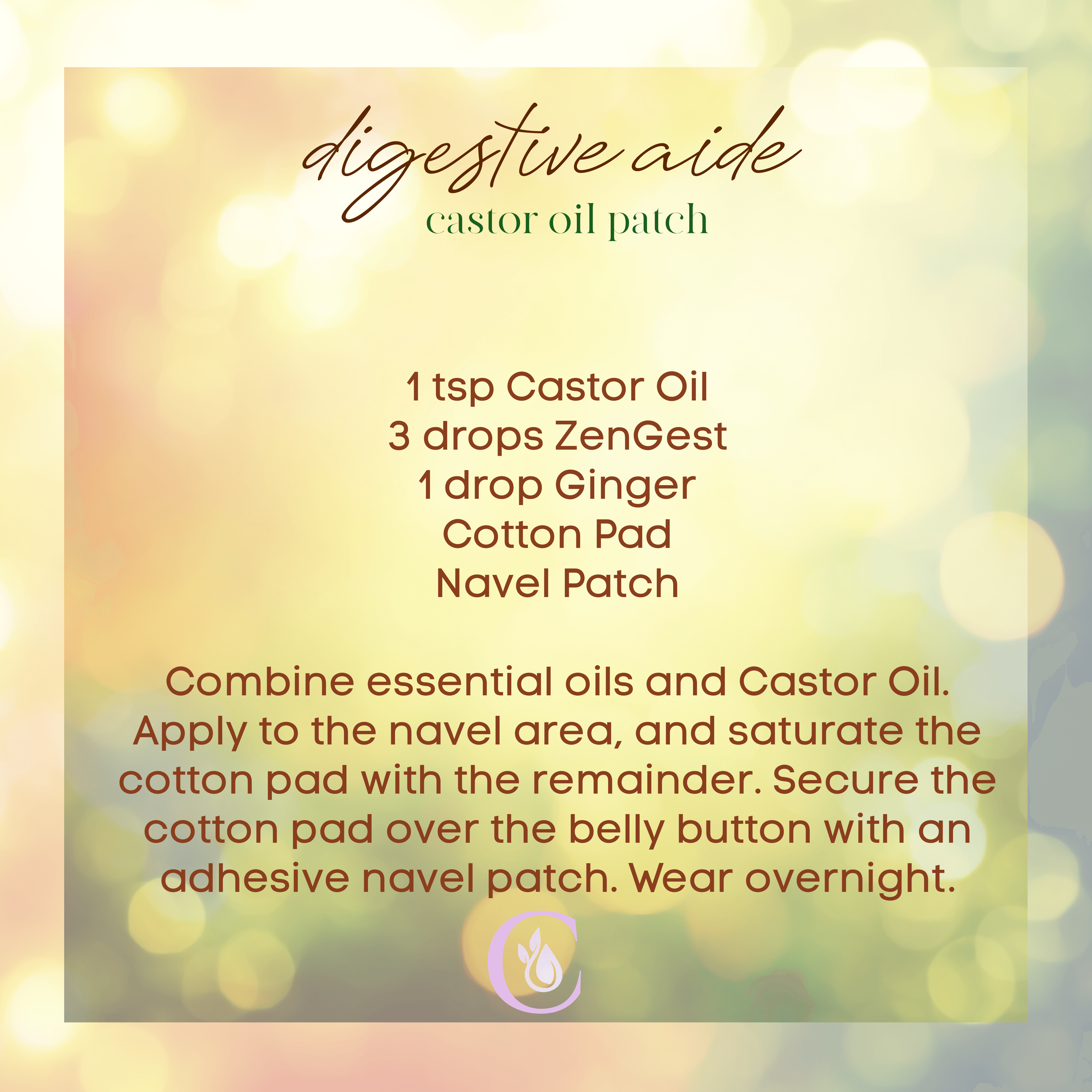 I'm going to say right up front, that when applying essential oils around the navel, ALWAYS dilute with a carrier oil. doTERRA's Touch oils are all perfect for this application... you can simply roll them around the belly button and rub them in. Now that we have dōTERRA Castor Oil, however, we can opt for a longer and deeper kind of treatment. When using a Castor Oil Patch, mix the essential oils you plan to use with about a teaspoon of Castor Oil, apply to the area and cover with a cotton pad (such as a baby washcloth or an old piece of cotton flannel) and then add an adhesive patch over top. Wear the patch for up to 24 hours.