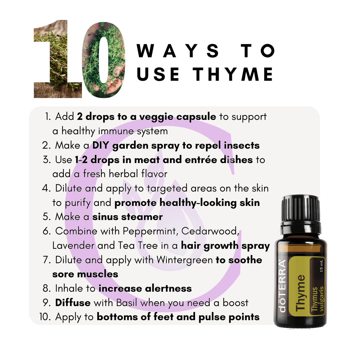 Thyme is another VERY HOT oil. This is an oil that I find to be particularly good for the lungs. In fact, I have a little "party trick" that I like to use when I have a cough. Any time I use this method, it relieves a cough just about immediately. First, slather the entire chest with your favourite carrier oil. Next, add 1-2 drops of Easy Air and rub it into the area. Now, add 1 drop of Thyme and rub that in as well. I like to use this layering method rather than mixing the essential oils together. Applying the carrier oil first protects the skin from the strong sensation of the Thyme oil. I'm not wishing for you to suffer from a cough, but when you do, remember this tip!