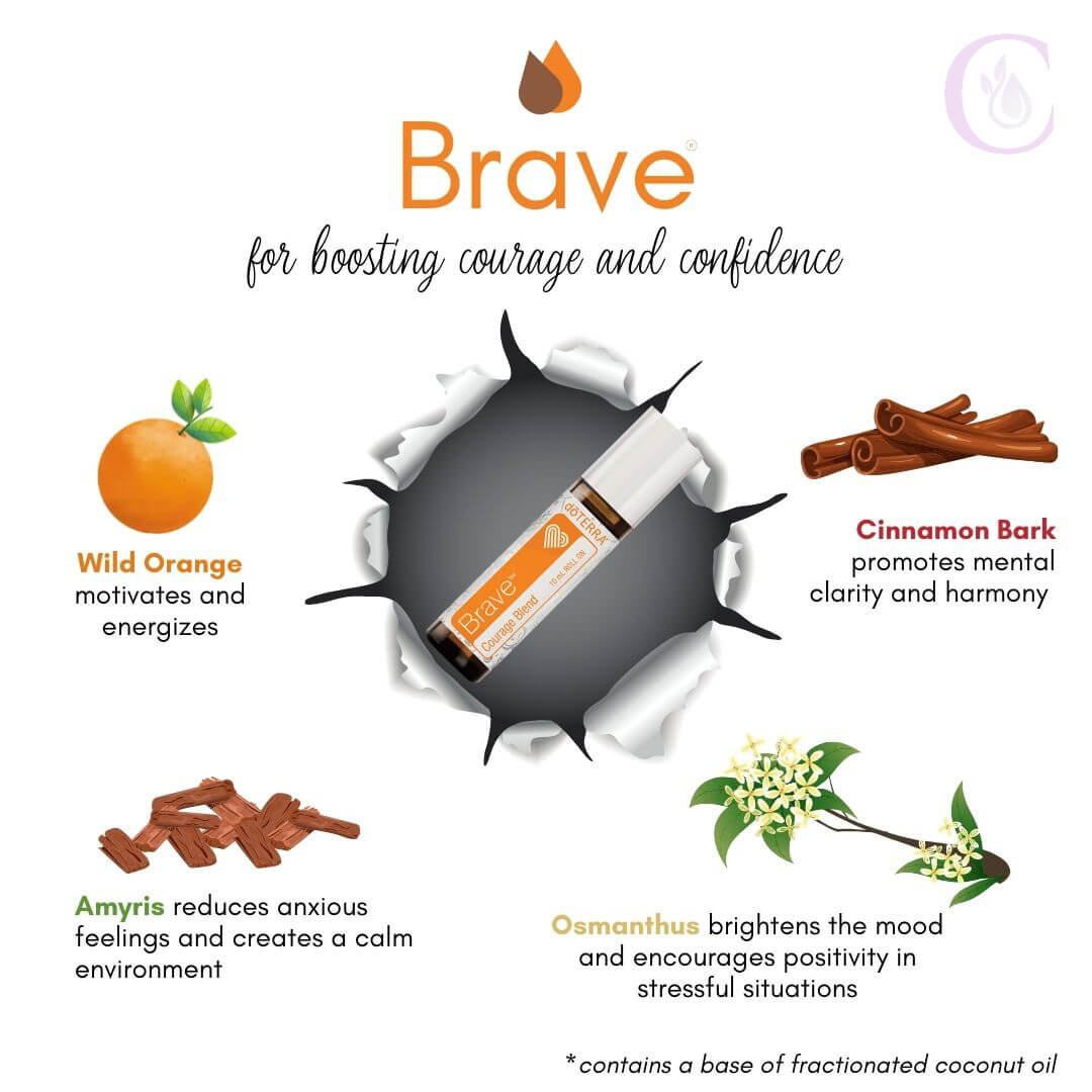 The Brave blend from doTERRA's Kid's Kit comes only in a 10 mL roll on. You can see in the graphic below how the four oils in this blend contribute to a brighter, bolder emotional aspect. Use it as a personal fragrance whenever you feel overwhelmed, fearful or unmotivated.