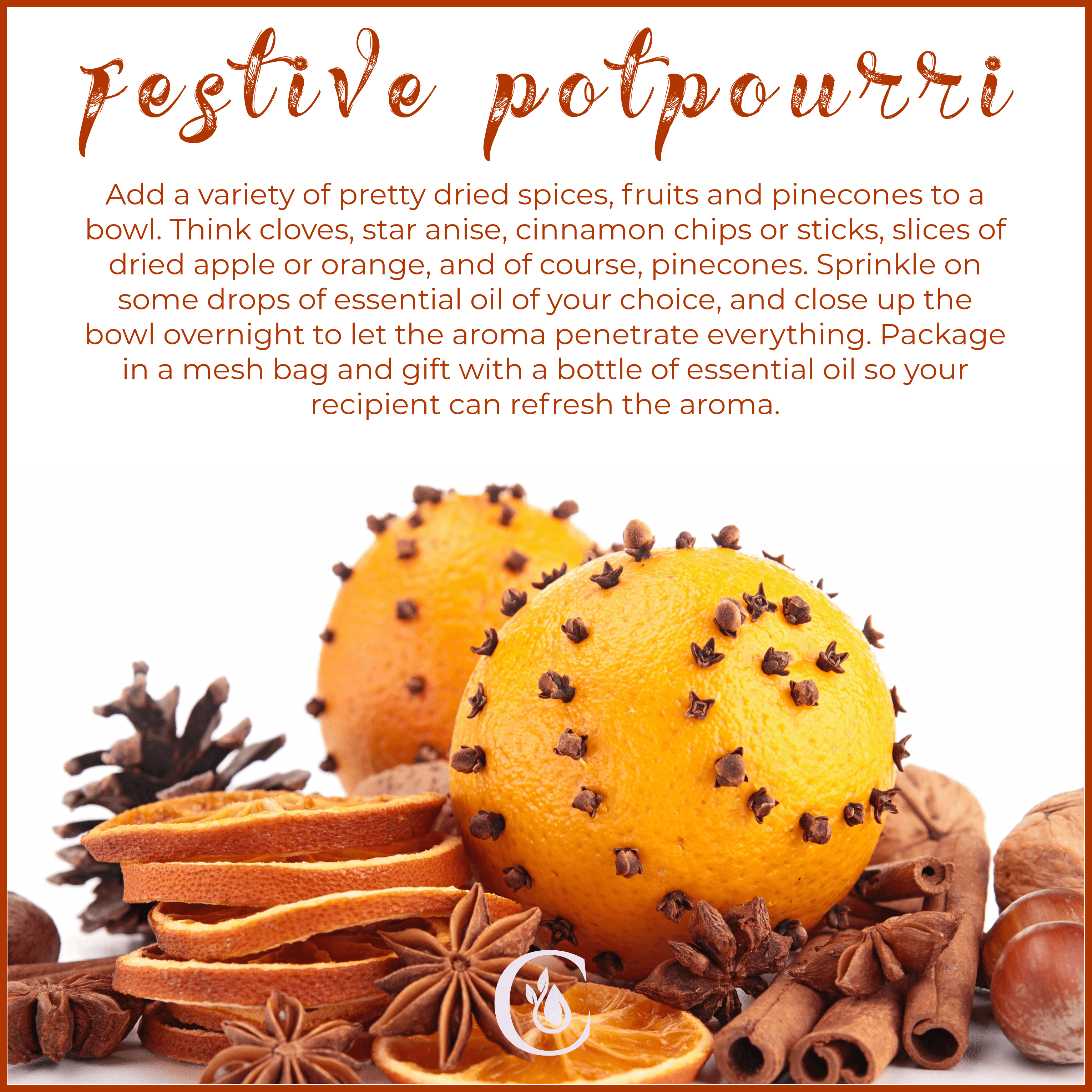 I remember making clove-studded oranges at Christmas time as a child, so I have great nostalgia for this classic festive potpourri element. You can include decorated oranges in this recipe for potpourri if you want, depending on your inclination and the time you want to spend making it. Gift the potpourri in a mesh bag or a cellophane bag, or right in a pretty bowl wrapped in cellophane. Include a bottle of essential oil so your recipient can refresh the aroma whenever they need to.