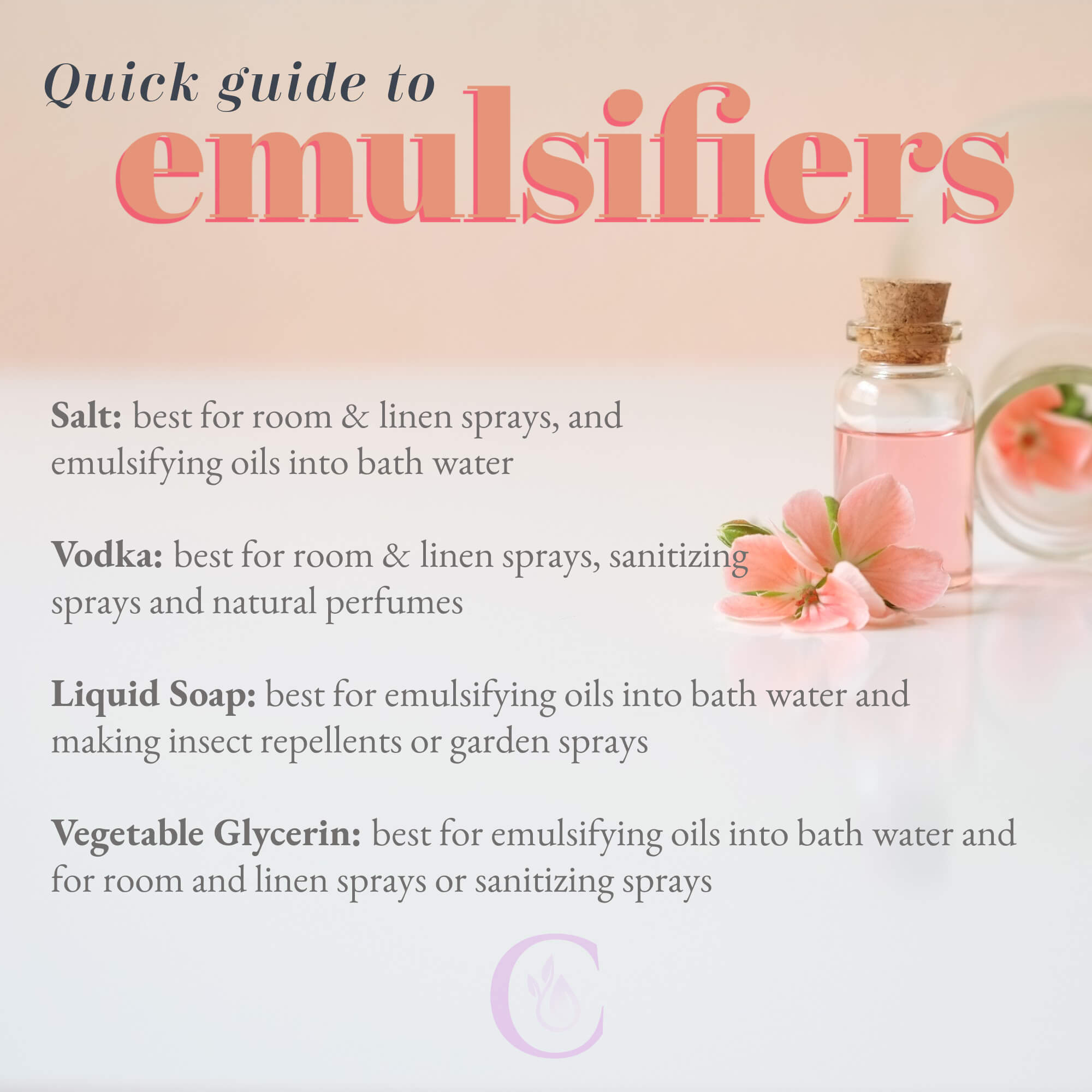 For sprays or spritzes, add just a pinch of natural sea salt to your mixture. You need only use just enough to encourage the oils to mix better with the water. Shake before use and enjoy. A sea salt or Epsom salt is a good emulsifier for the bath as well, adding their own health benefits to whatever essential oils you are using.