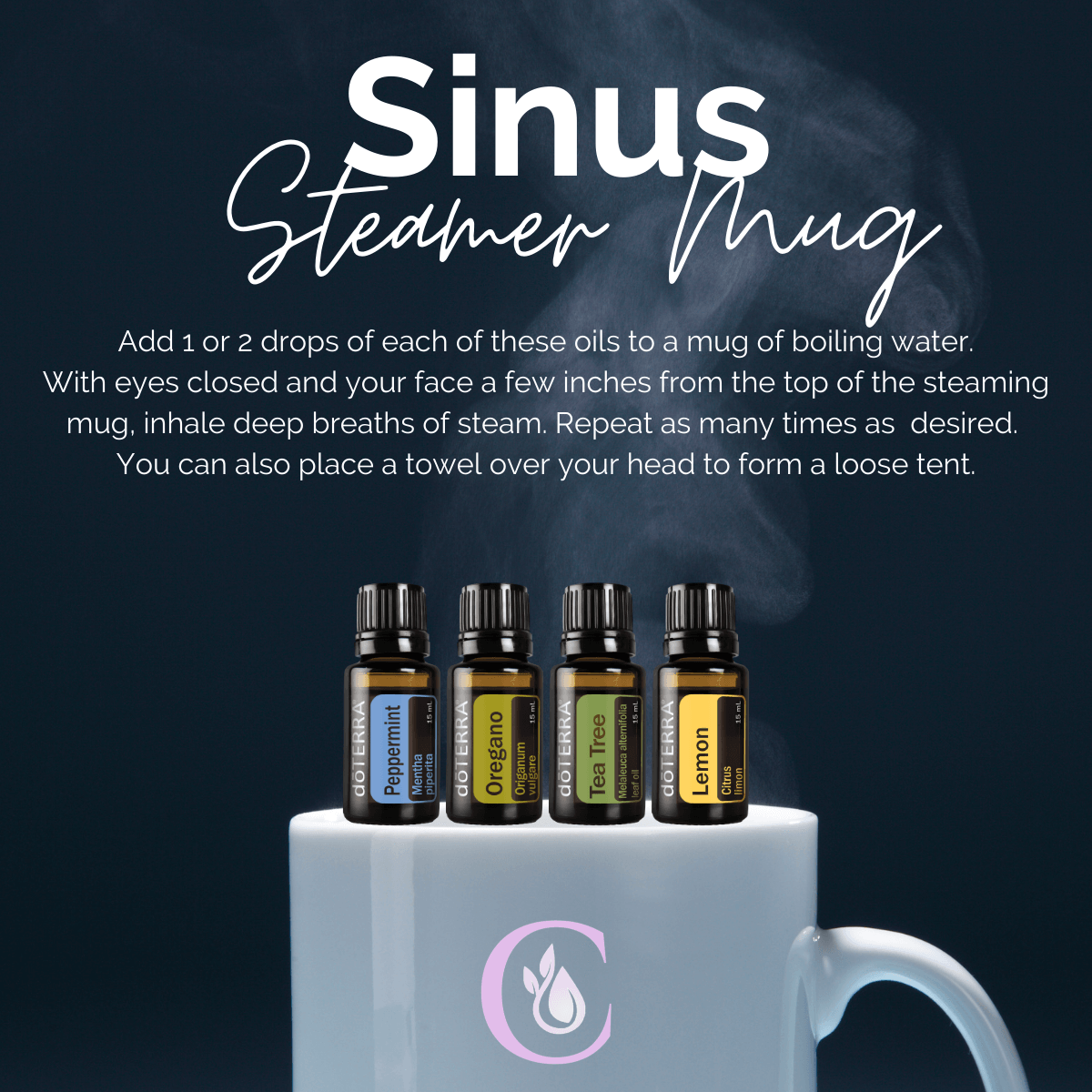 A steamer mug is a super simple way to unclog sinuses and ease breathing. You can also use a bowl, but a mug has a handle which I find is a good way to grip it. You can use all of the oils shown in the picture, or any combination. Or, pick others that you know will help with congestion (Eucalyptus, Easy Air, Rosemary, etc.)