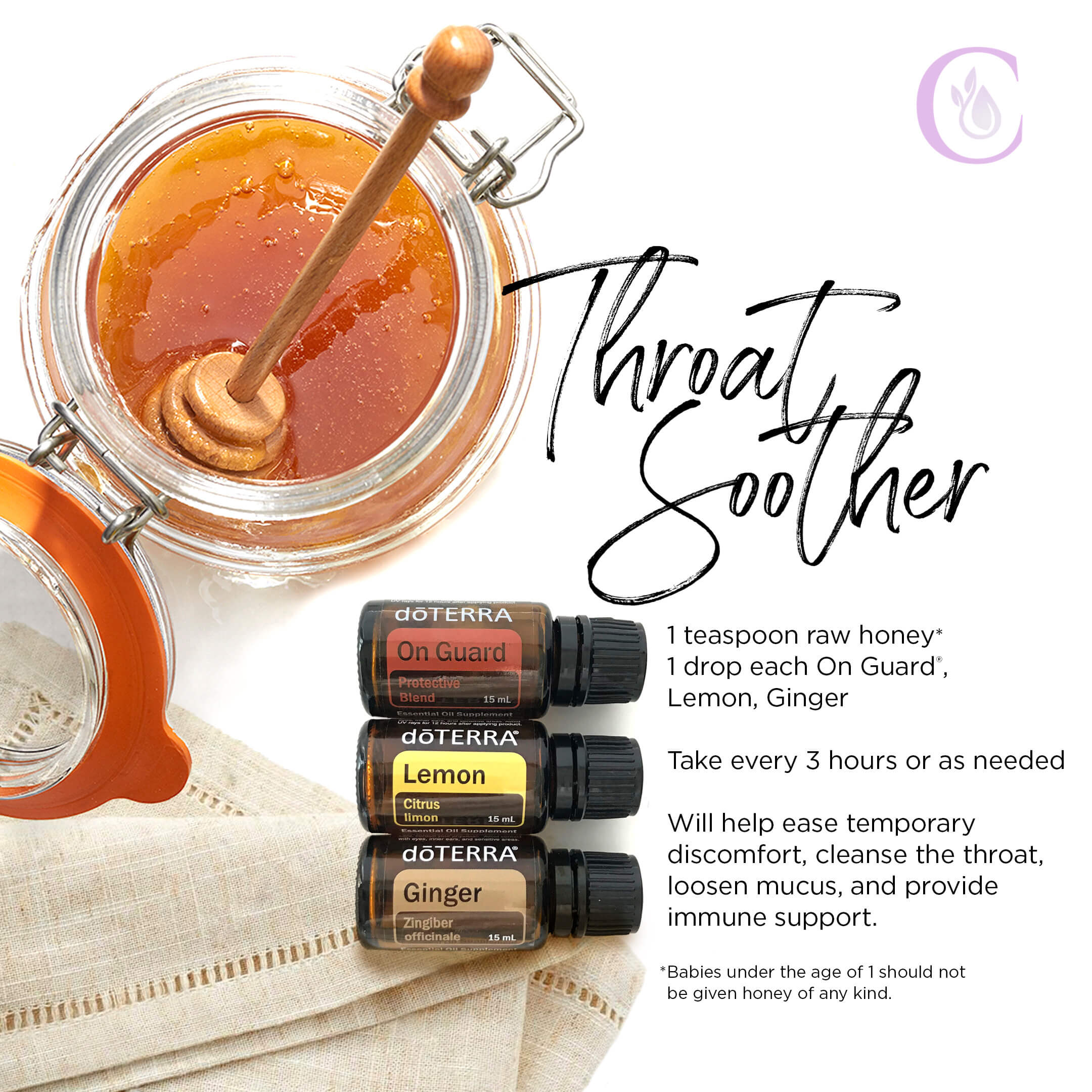 Honey is a wonderful natural remedy all on its own. Combining it with your essential oils makes it even more potent. I like to take a drop of Melissa with a bit of honey when I'm feeling under the weather. You can also make a tea with a few drops of On Guard, honey and a splash of milk. Or, make this throat-soothing recipe: