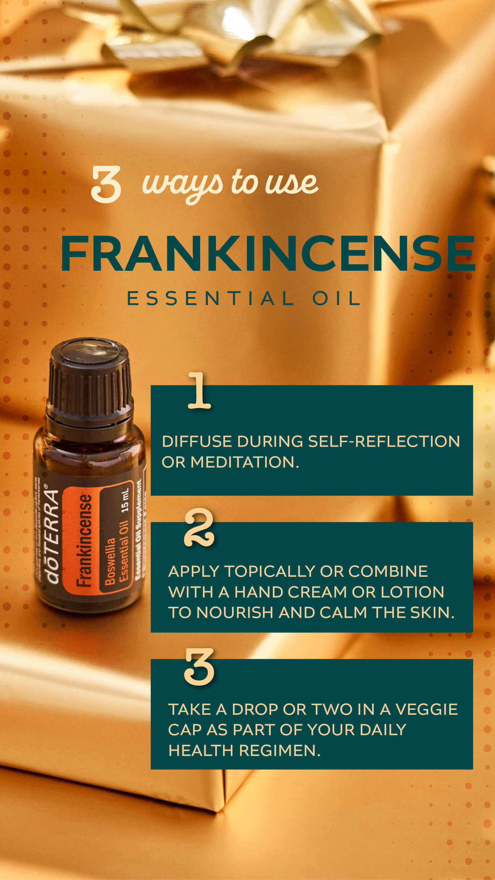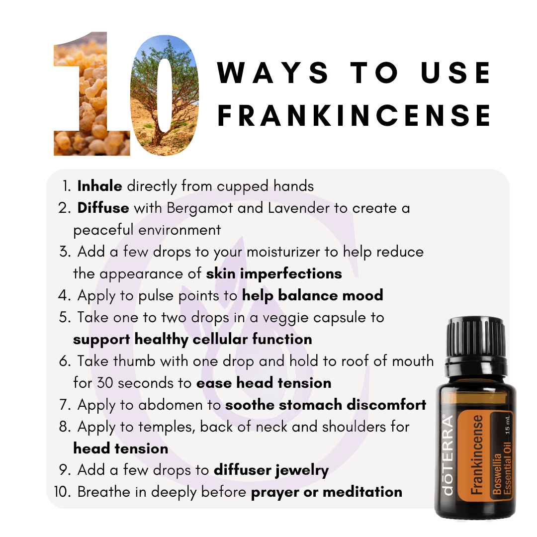 Inhale from the bottle, diffuse it, or place a drop in your hands and inhale. Apply 1-3 drops on the crown of the head, the forehead, or behind the ears. The bottom of the feet is another common place to apply Frankincense. Frankincense has a long history of oral and internal use. Take 1-2 drops under the tongue, in a capsule, or in water.