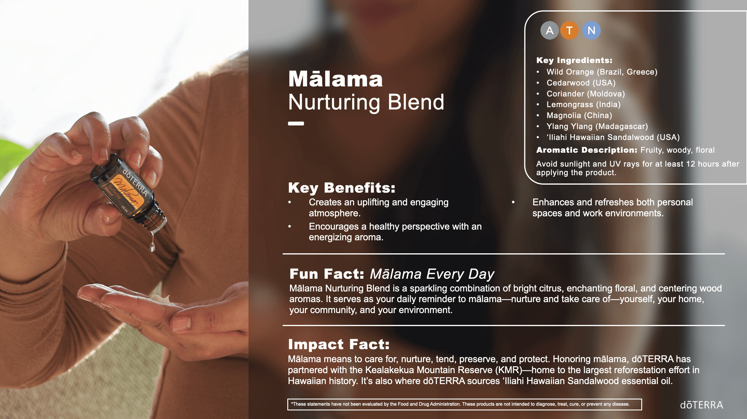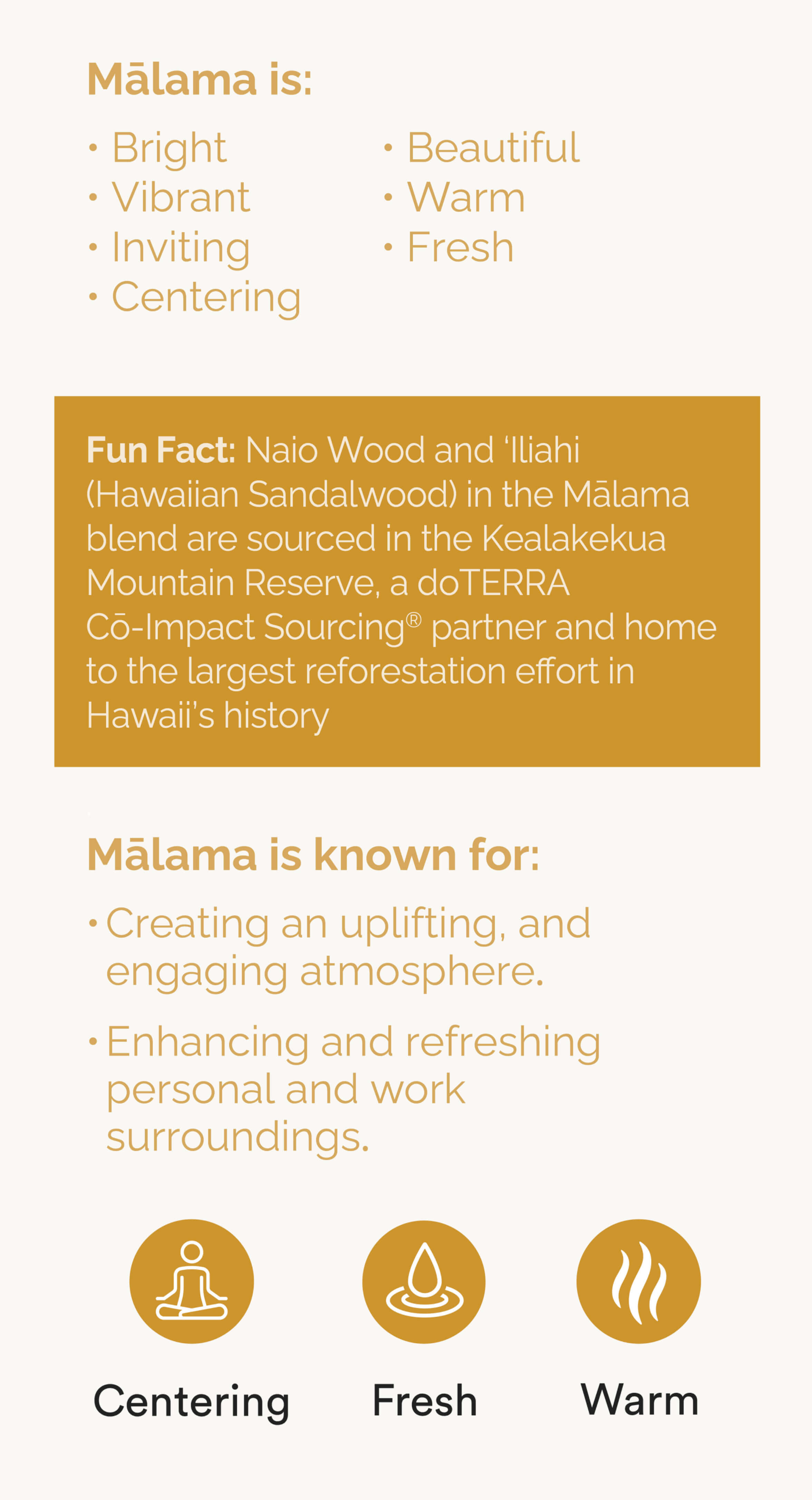 Mālama is made up of Wild Orange, Cedarwood, Coriander, Amyris, Lemongrass, Magnolia, Ylang Ylang, Pepper Sichuan, Bucchu Aged, Naio Wood, and ‘Iliahi (Hawaiian Sandalwood).